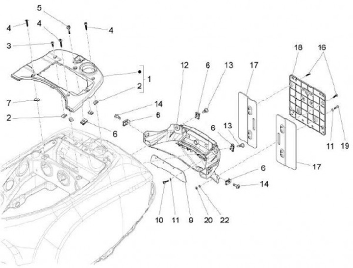 Penutup di belakang kompartemen helm -PIAGGIO- Vespa ET4 (ZAPM04, ZAPM19, ZAPC26), Vespa LX (ZAPC38, ZAPM44, ZAPM68), Vespa LXV (ZAPC38, ZAPM44, ZAPM68), Vespa S (ZAPC38, ZAPM44, ZAPM68)