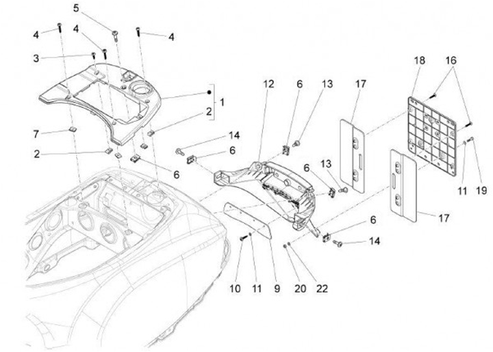 Penutup di belakang kompartemen helm -PIAGGIO- Vespa ET4 (ZAPM04, ZAPM19, ZAPC26), Vespa LX (ZAPC38, ZAPM44, ZAPM68), Vespa LXV (ZAPC38, ZAPM44, ZAPM68), Vespa S (ZAPC38, ZAPM44, ZAPM68)