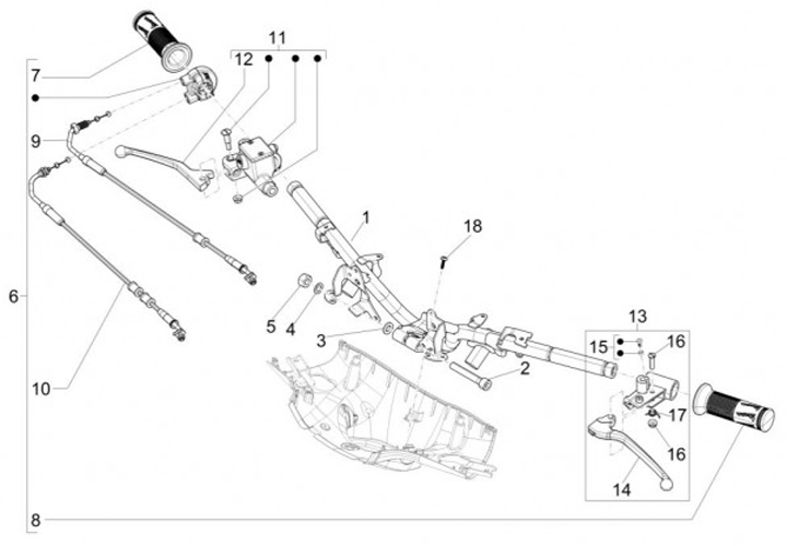 Tuas rem, kiri -PIAGGIO- Vespa Primavera 125 (RP8M82100, RP8M82310, RP8M82500, RP8M82821, ZAPM81100), Vespa Sprint 125 (RP8M82111), Vespa Sprint 150 (ZAPMA1400, ZAPMA1401, ZAPMD1201), Vespa LT 125 (RP8M66503), Vespa LT 150 (RP8M66603), Piaggio Fly 125