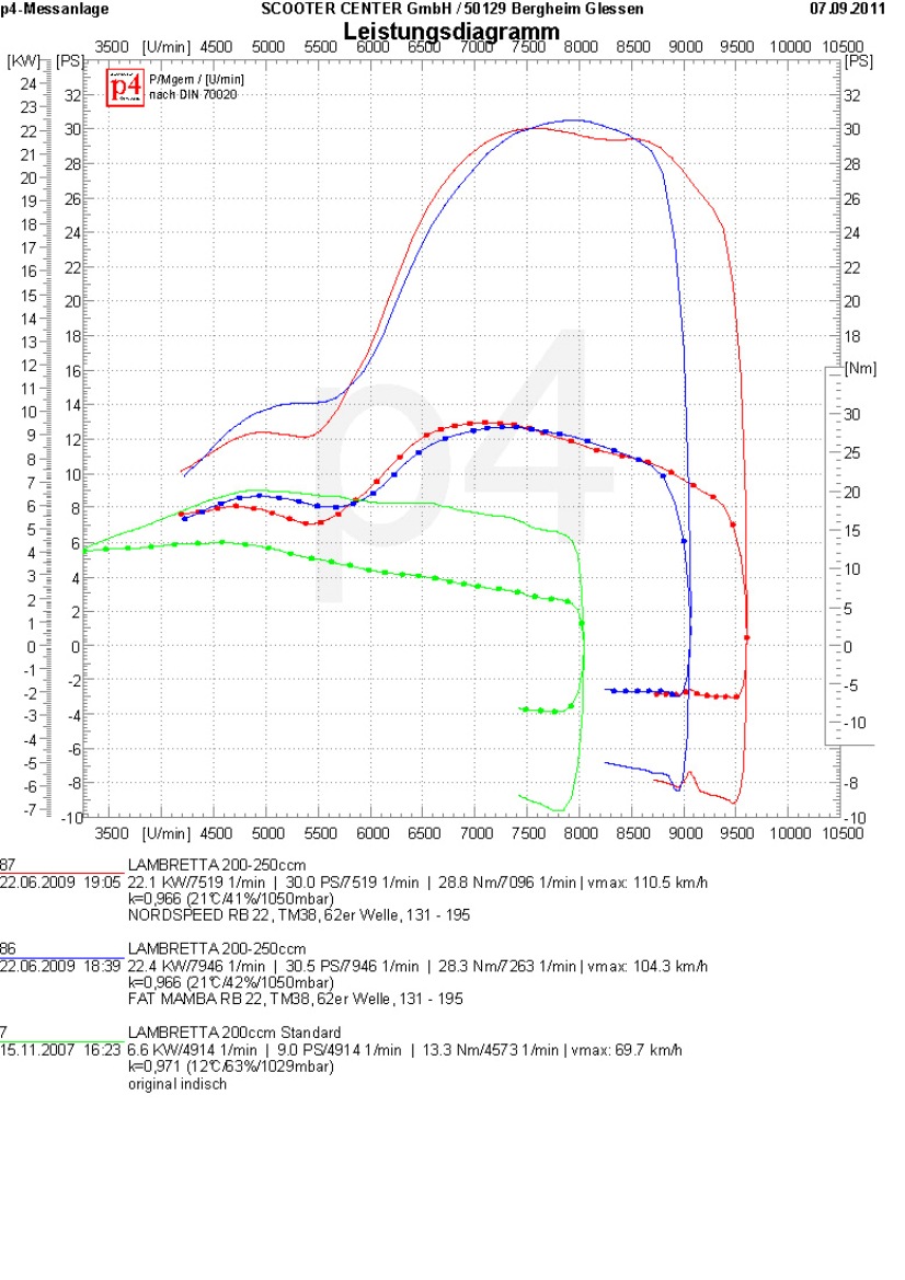 Pada diagram di bawah ini Anda dapat melihat silinder RB22 dengan langkah poros engkol 62 mm, timing overflow 131°, exhaust 195°, intake 32°. Karburator Mikuni 38 mm. Referensi yang berwarna hijau adalah mesin GP 200 India yang benar-benar asli (karburator SH22, knalpot lubang besar India).