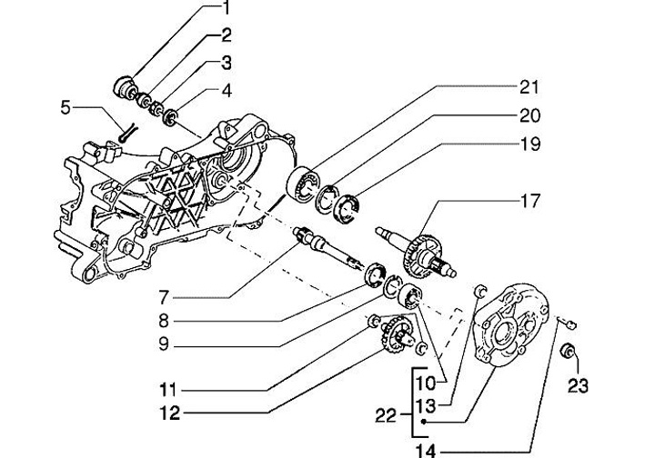 Poros input transmisi / poros primer Z = 14 -PIAGGIO- Vespa ET2 50 (ZAPC16000, ZAPC38100), Vespa LX 50 (ZAPC38101, ZAPC38104), Vespa LXV 50 (ZAPC38102), Vespa S 50 (ZAPC38103), Vespa Sprint 50 (ZAPC53201), Aprilia Mojito 50 (ZD4TF), Derbi Atlantis 50 (VTH