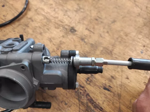 BGM6445 digunakan sebagai kabel choke. Kabel ini sudah memiliki panjang selubung luar yang pas untuk dipasang di Vespa Smallframe. Longgarkan mur tuas choke bagian dalam yang kecil dengan SW10 dan pastikan sekrupnya tidak jatuh ke bawah ke arah ruang karburator. Saat melepas tuas choke yang asli, lihatlah cakram melengkung (
