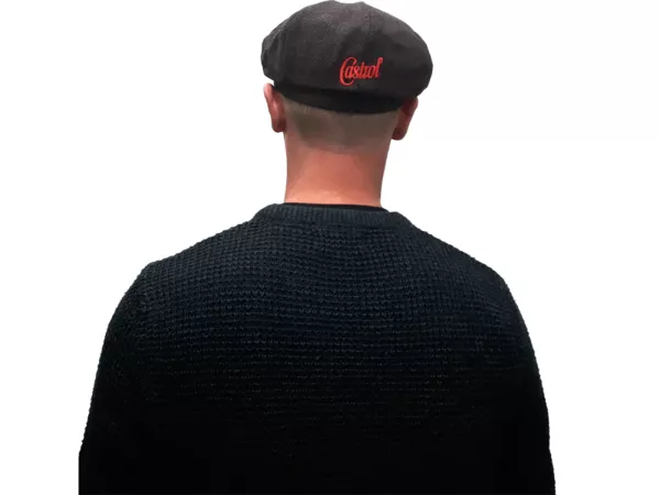 Topi geser dari kain herringbone berwarna coklat dan hitam dengan bordiran huruf Castrol klasik di bagian belakang. Konstruksi 8 panel, dengan kancing di bagian atas dan bagian atas yang diperkuat. Sempurna untuk digunakan dari atas ke bawah pada hari musim gugur. Tersedia dalam 2 ukuran, kecil hingga sedang dan besar hingga ekstra besar.