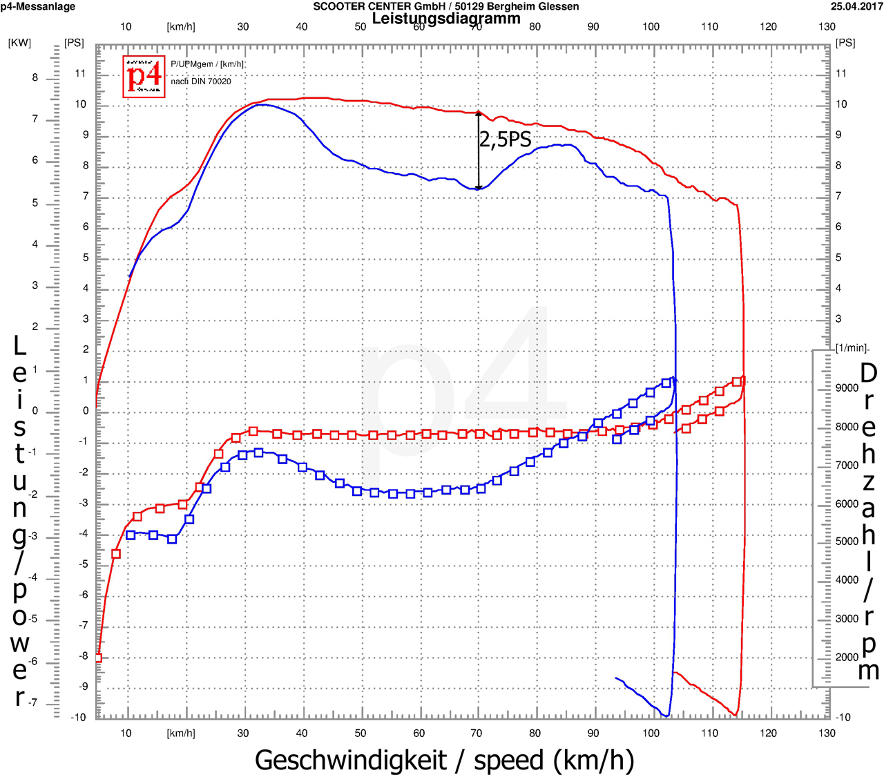 Di jalan raya, kendaraan ini secara signifikan lebih lincah, lebih cepat dan jauh lebih unggul daripada skuter standar, terutama saat menarik diri. Rasio gigi yang lebih panjang memiliki efek yang lembut pada mesin. Mesin tetap berada pada tingkat putaran yang sama hampir sampai ke kecepatan tertinggi dan tidak mulai berputar lebih tinggi dan lebih tinggi lagi dari 70 km/jam.