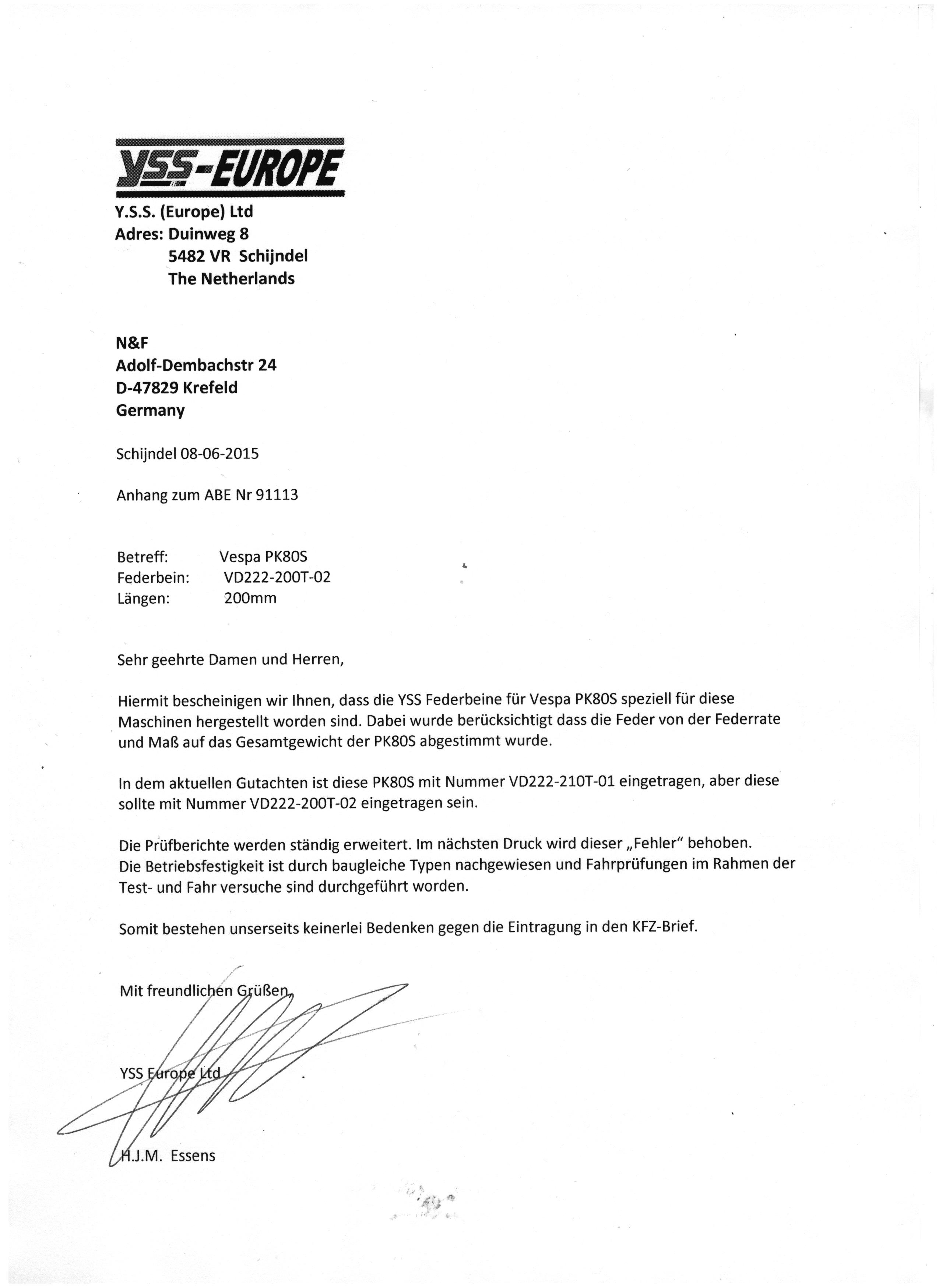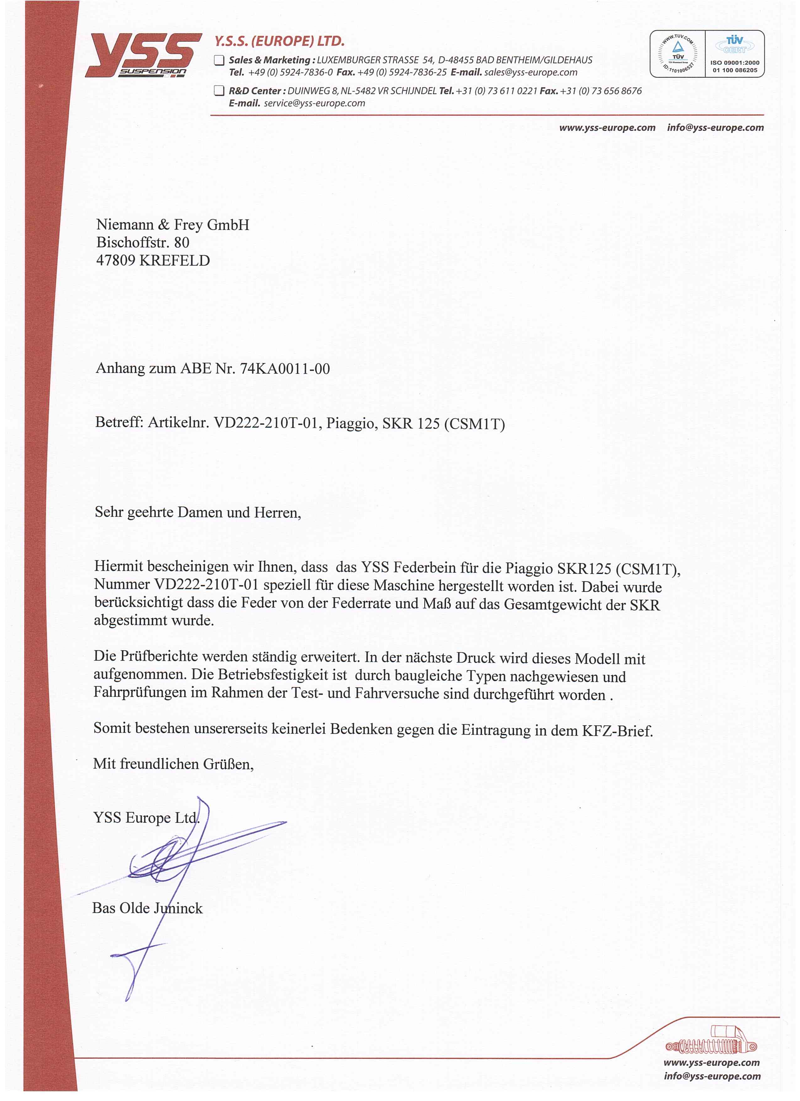 Gli ammortizzatori YSS hanno anche un certificato TÜV per i seguenti modelli (vedi "download"):