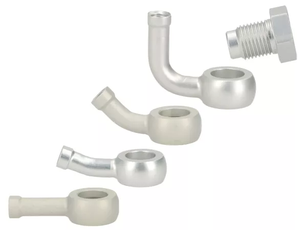 Si avvita sul tubo tramite una filettatura fine. Disponibile in cinque versioni diverse. Quattro attacchi a banjo con angolazioni diverse e un collegamento diretto per collegare il tubo direttamente alla pompa o alla pinza del freno.