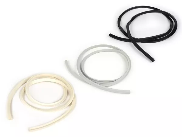 Gomma profilata adatta universalmente a tutti i telai Vespa di grandi dimensioni che hanno un vano bagagli. La gomma deve essere tagliata nei rispettivi raggi del tunnel del telaio con una forma a V, in modo che non faccia pieghe e si adatti bene.