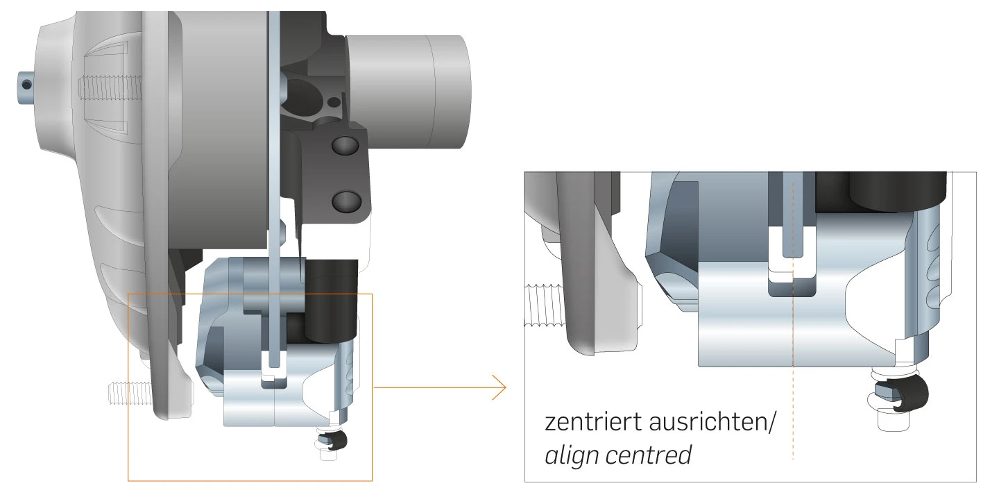 9. Utilizzare le rondelle in dotazione per regolare la posizione della pinza del freno rispetto al disco del freno. Ripetere i passaggi da 3 a 9 con le opzioni fino a centrare la pinza del freno sul disco del freno, come illustrato nella Fig. 13. Una volta regolato il supporto della pinza del freno, serrare il dado centrale del tamburo del freno a 90 Nm. Serrare i bulloni della pinza del freno a 16 Nm.