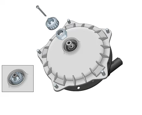 4 Ingrassare il cuscinetto del supporto della pinza freno e montarlo sull'assale. 5. posizionare il disco a D appropriato sull'assale e allinearlo con l'incavo dell'assale. 6. posizionare l'anello di sicurezza Ø 20 mm sull'asse e assicurarsi che sia ben inserito nella scanalatura, quindi posizionare l'O-ring.