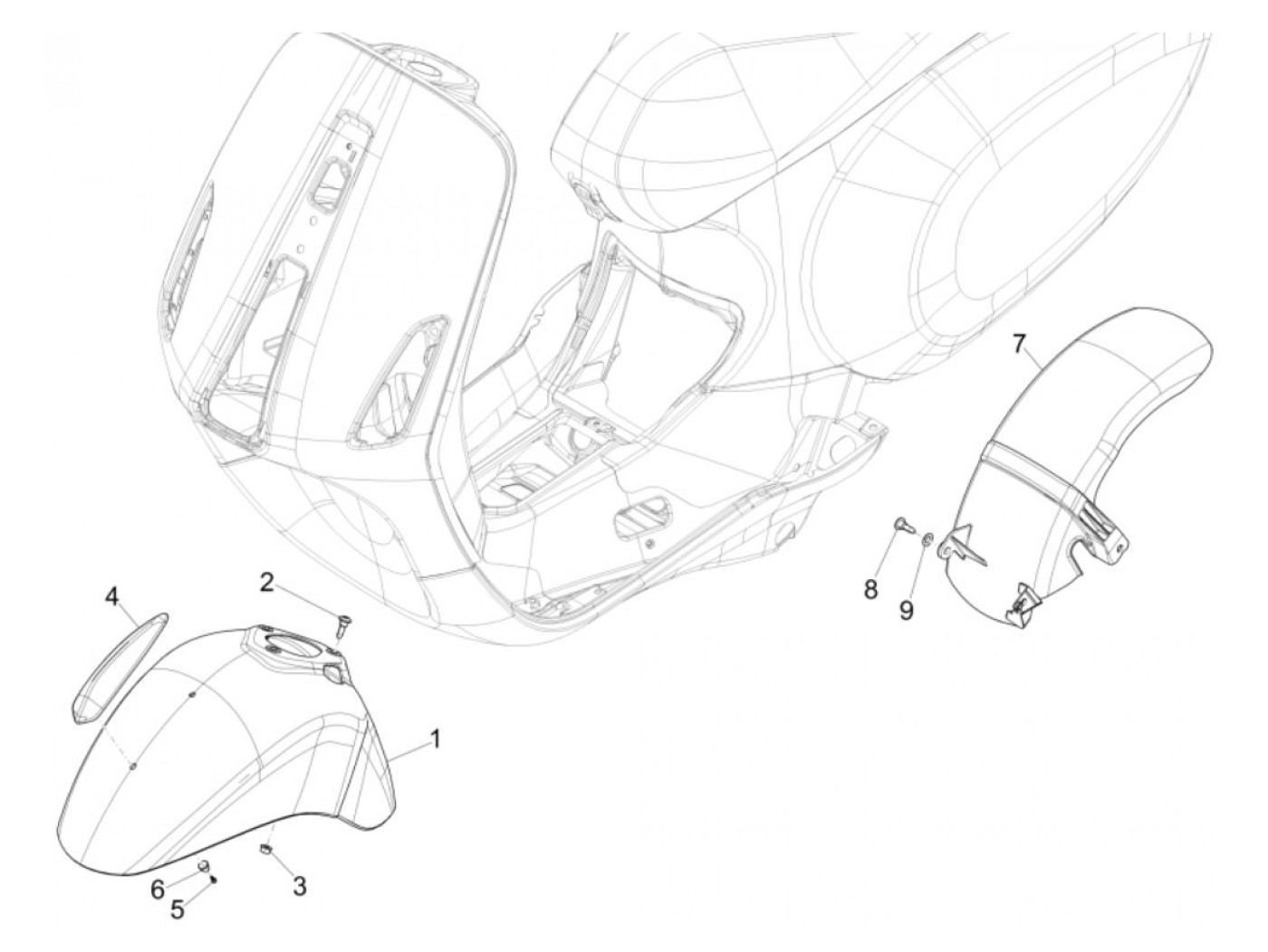 Parafango posteriore -PIAGGIO- Vespa Primavera 125 (ZAPMA1100, ZAPMA1101, ZAPMD1100), Vespa Primavera 150 (ZAPMA1201, ZAPMA1200, ZAPMD120), Vespa Sprint 125 (ZAPMD1101), Vespa Sprint 150 (ZAPMA1400, ZAPMA1401, ZAPMD1201)