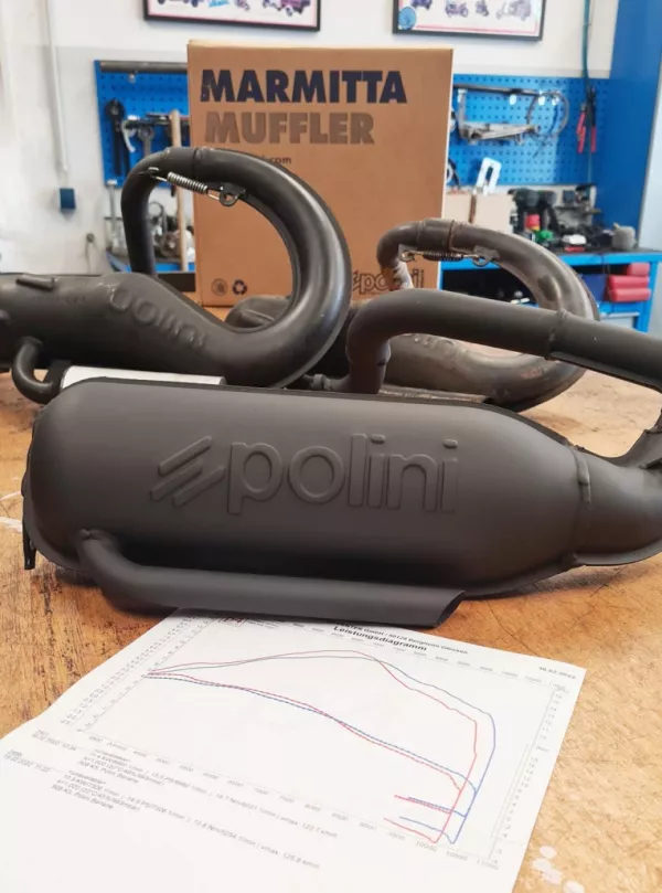 Polini ha fatto un buon lavoro e ha sviluppato uno scarico molto bello per la guida di tutti i giorni con alcuni buoni miglioramenti. La posizione più accessibile della molla, il collegamento a innesto più solido e la staffa facilmente regolabile sono caratteristiche positive. L'utilizzabilità su pneumatici più grandi è a mio avviso un ulteriore vantaggio. In termini di rumore, la nuova banana è un po' più silenziosa del modello precedente. Ulteriori impressioni sulla nuova banana Polini sono disponibili nel video