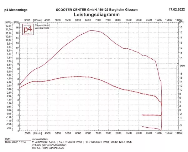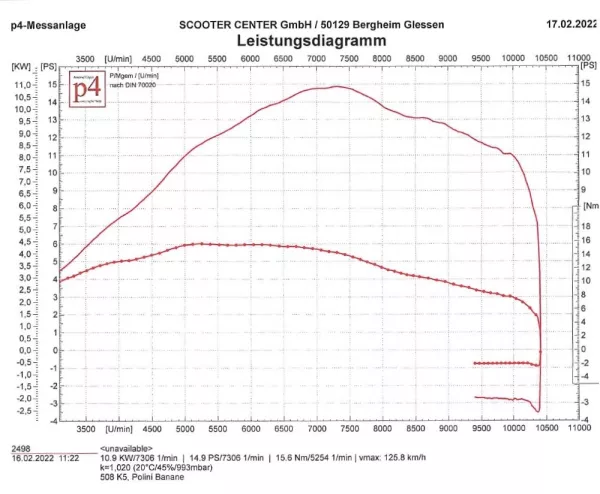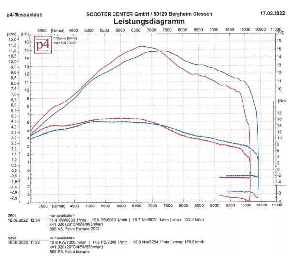 Come previsto, dopo il riscaldamento la 508 eroga 14,9 CV a 7300 giri/min. Quindi tutto è sano e per il confronto viene montato il nuovo scarico originale Polini. Anche sul banco di prova, la coppia di spunto significativamente più elevata si nota al momento del riscaldamento. Polini ha fatto un buon lavoro. Ciò che sembra diverso sul rullo del banco prova è visibile anche nel grafico.
