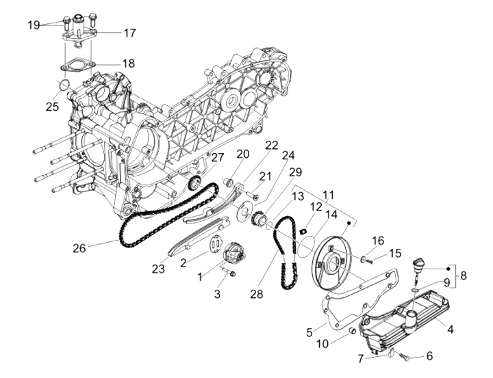 Coppa olio -PIAGGIO- Vespa GT L 125 (ZAPM31100, ZAPM31101), Vespa GT L 200 (ZAPM31200), Vespa GTS 125 (ZAPM31300), Vespa GTV 125 (ZAPM31301), Vespa LX 125 (ZAPM44100, ZAPM44300, ZAPM68100), Vespa LX 150 (ZAPM44200, ZAPM44400), Vespa LXV 125 (ZAPM68102, ZA