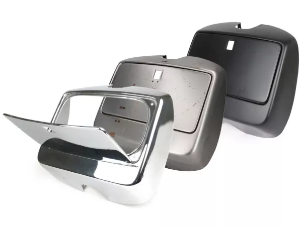 Riproduzione del vano bagagli dei modelli Vespa PX Lusso dal 1984 al 2010. Montato nel paragambe sulle quattro viti originali. Fornito comprensivo di sportello vano bagagli premontato senza serratura e gommini. Si prega di provare il vano bagagli prima della verniciatura e di regolare il contorno se necessario. Disponibile in versione non verniciata/primer per il trasporto e cromata.