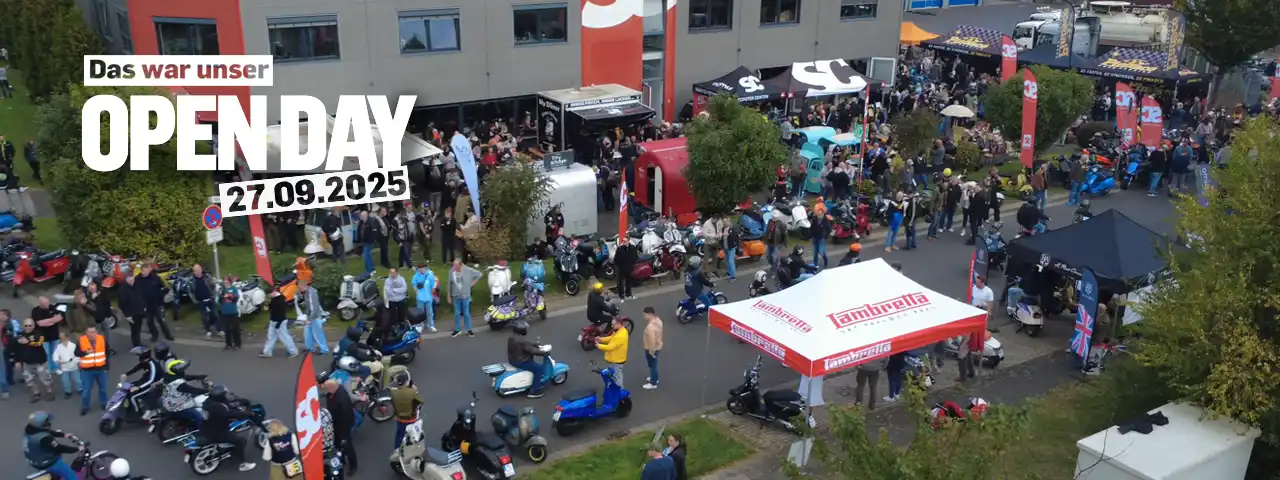 Zweimal im Jahr öffnen sich die Türen des Scooter Centers, und das Außengelände in Bergheim wird zum Treffpunkt für die gesamte Rollerfamilie. Vespas, Lambrettas und Scooter aller Art fahren vor, diverse Händler bieten an ihren Ständen Accessoires, gebrauchte Ersatzteile oder auch ganze Roller zum Verkauf an, auf dem Grill brutzeln leckere Würstchen, und aus dem Prüfstand übertönt der süße Sound eines hochgezüchteten Rollermotors die meisten Benzingespräche.