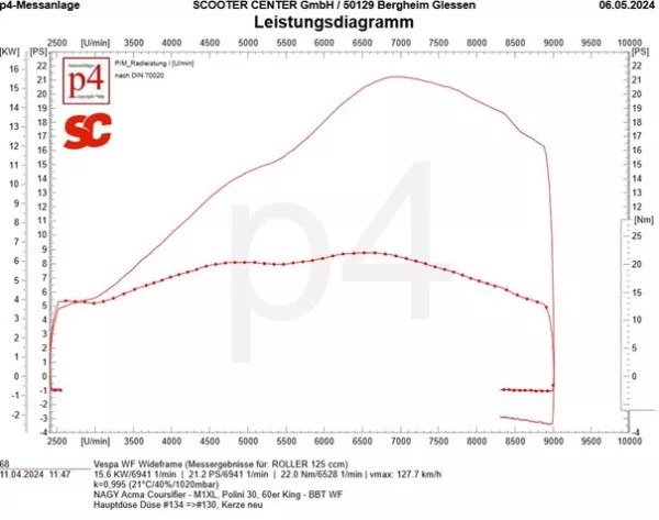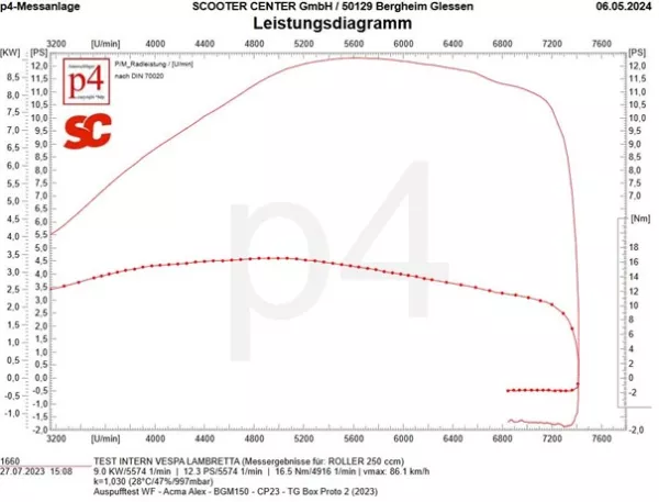 Een speciale motor gebaseerd op een Vespa GS150 wideframe motorhuis, die is omgebouwd met een membraan-geregelde Quattrini cilinder voor een PX125/150 motor. In combinatie met een 60mm koningsas resulteert dit in een cilinderinhoud van 181cc. Het motorblok is gemonteerd in een wideframe, waardoor de BGM Pro Touring uitlaat ook op veel belangstelling kon rekenen. De cilinder is hier onbewerkt en loopt met stuurhoeken van 124/176. De BGM box levert ook hier veel vermogen. 21 pk en 22 Nm zijn behoorlijk opmerkelijk voor een systeem dat puur is ontworpen als toeruitlaat en geen groot volume heeft. Mogelijk zou er nog meer mogelijk zijn met een kleinere stuurhoek, maar voor deze vergelijking is het systeem ideaal herkenbaar omdat het zelfs met zeer sportieve motoren perfect rijdbaar is en nog steeds hoge prestaties levert. Ook hier is het rijgeluid zeer aangenaam, vandaar dat de eigenaar van de auto de uitlaat direct op de auto heeft laten monteren.