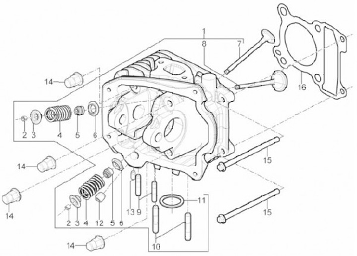 Cilinderkop incl. kleppen en veren -PIAGGIO 125/150cc, LEADER, 2V- Vespa ET4, LX, LXV, S, Piaggio Fly, Liberty, Skipper, TPH, X8 Street, ZIP2, Aprilia Mojito, SR Motard, Benelli Adiva, Derbi Boulevard, Sonar, Italjet Torpedo