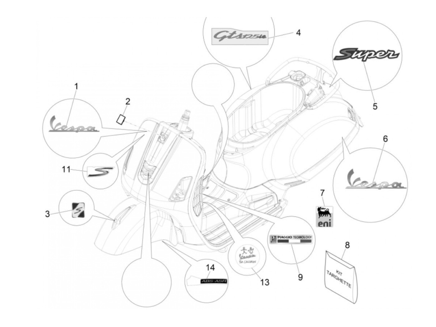 Belettering -PIAGGIO- Vespa voor kinderen - Vespa GTS 125 (ZAPMA3100, ZAPMA3200, ZAPMA3700), Vespa GTS 150 (ZAPMA3200, ZAPMA3100), Vespa GTS 250 (ZAPM45100), Vespa GTS 300 (ZAPM45200, ZAPM45202, ZAPMA3300), Vespa GTS HPE 300 (ZAPMA3600), Vespa GTS Super 1