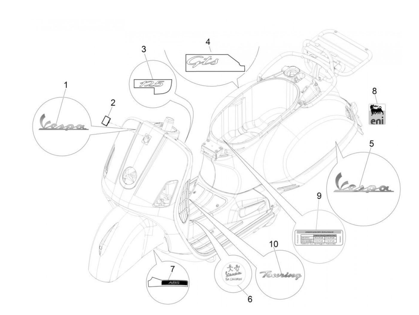 Belettering -PIAGGIO- ABS - Vespa GTS 125 (ZAPMA3100, ZAPMA3200, ZAPMD3200), Vespa GTS 150 (ZAPMA3200, ZAPMA3100), Vespa GTS Super 125 (ZAPMA3100, ZAPMA3200, ZAPMD3200)