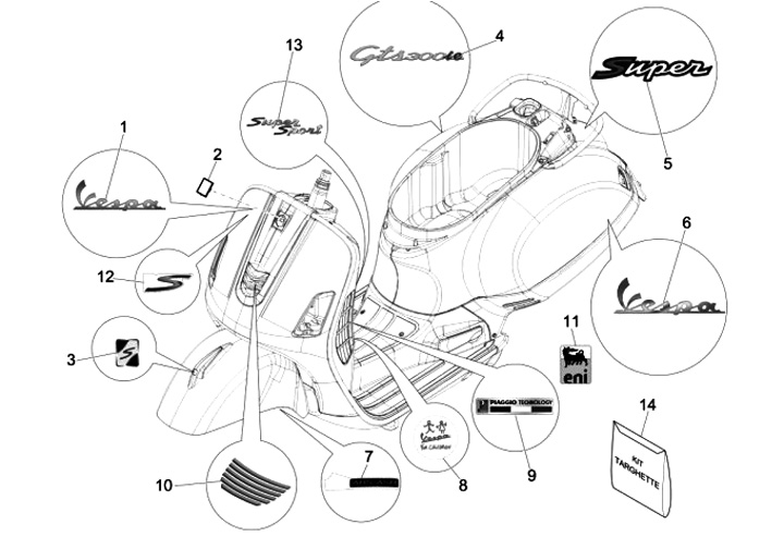 Belettering -PIAGGIO- Vespa voor kinderen - Vespa GTS 125 (ZAPMA3100, ZAPMA3200, ZAPMA3700), Vespa GTS 150 (ZAPMA3200, ZAPMA3100), Vespa GTS 250 (ZAPM45100), Vespa GTS 300 (ZAPM45200, ZAPM45202, ZAPMA3300), Vespa GTS HPE 300 (ZAPMA3600), Vespa GTS Super 1