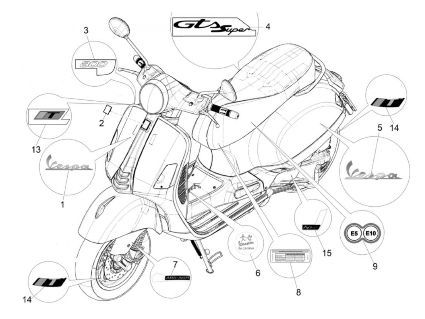 Belettering -PIAGGIO- (E5)/(E10) - Vespa GTS 125 (ZAPMA3700), Vespa GTS HPE 300 (ZAPMA3600), Vespa GTS Super 125 (ZAPMA3700), Vespa GTS Super HPE 300 (ZAPMA360, ZAPMD3100, ZAPMD3101, ZAPMD3102), Vespa Primavera 125 (ZAPMA1100, ZAPMA1101, ZAPMD1100), Vespa