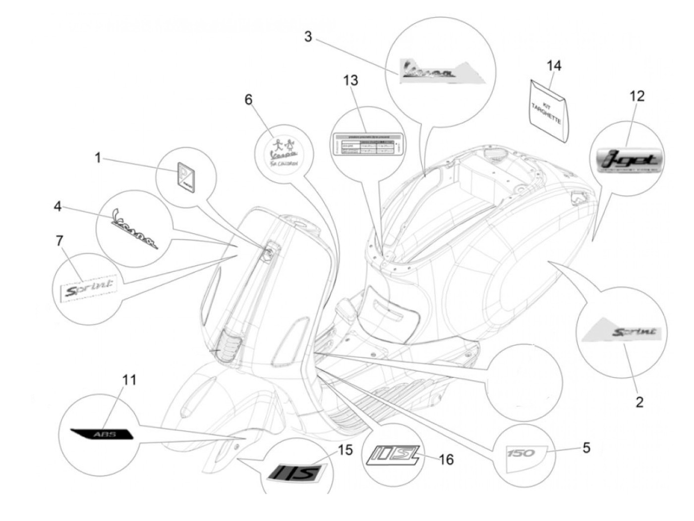 Belettering -PIAGGIO- ABS - Vespa Primavera 125 (ZAPM81100, ZAPM81101, ZAPMA1100, ZAPMA1101, ZAPMD1100), Vespa Primavera 150 (ZAPMA1200, ZAPM81200, ZAPM81201, ZAPMA1201, ZAPMD120), Vespa Sprint 125 (ZAPM81300, ZAPM81301, ZAPMA1300, ZAPMA1301, ZAPMD1101),