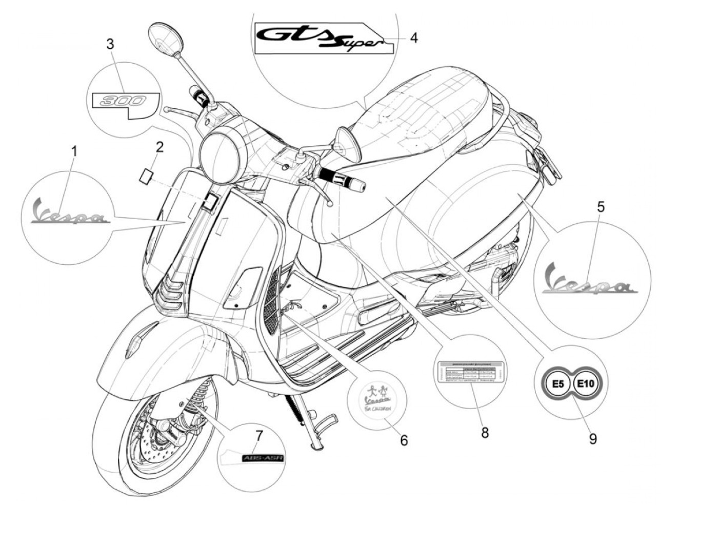 Belettering -PIAGGIO- Vespa voor kinderen - Vespa GTS 125 (ZAPMA3100, ZAPMA3200, ZAPMA3700), Vespa GTS 150 (ZAPMA3200, ZAPMA3100), Vespa GTS 250 (ZAPM45100), Vespa GTS 300 (ZAPM45200, ZAPM45202, ZAPMA3300), Vespa GTS HPE 300 (ZAPMA3600), Vespa GTS Super 1