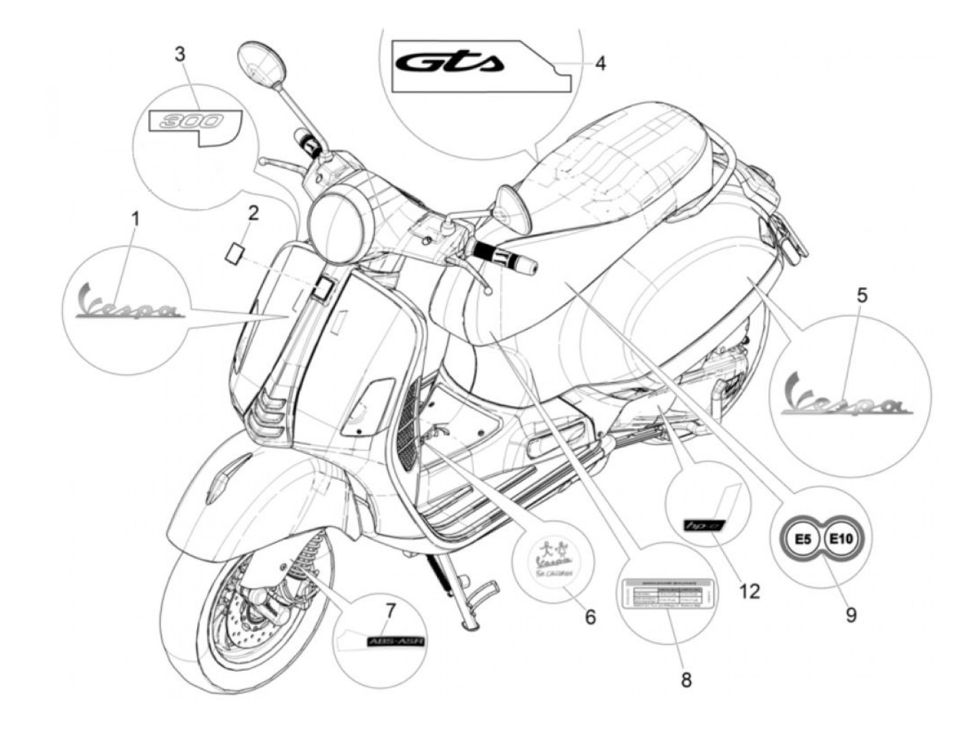 Belettering -PIAGGIO- (E5)/(E10) - Vespa GTS 125 (ZAPMA3700), Vespa GTS HPE 300 (ZAPMA3600), Vespa GTS Super 125 (ZAPMA3700), Vespa GTS Super HPE 300 (ZAPMA360, ZAPMD3100, ZAPMD3101, ZAPMD3102), Vespa Primavera 125 (ZAPMA1100, ZAPMA1101, ZAPMD1100), Vespa