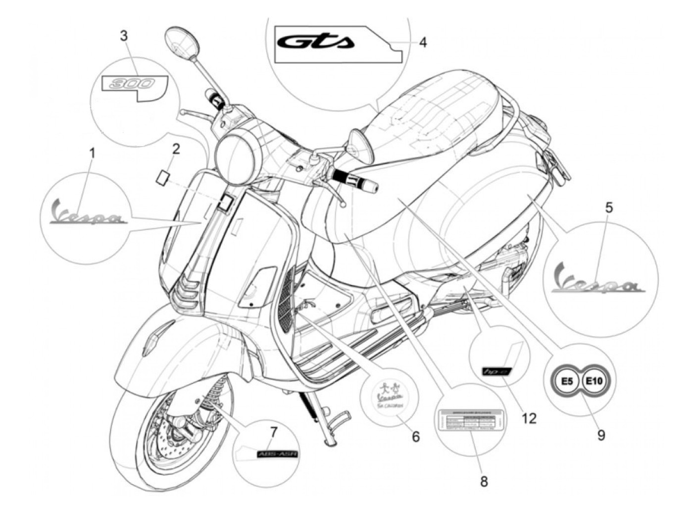 Belettering -PIAGGIO- (E5)/(E10) - Vespa GTS 125 (ZAPMA3700), Vespa GTS HPE 300 (ZAPMA3600), Vespa GTS Super 125 (ZAPMA3700), Vespa GTS Super HPE 300 (ZAPMA360, ZAPMD3100, ZAPMD3101, ZAPMD3102), Vespa Primavera 125 (ZAPMA1100, ZAPMA1101, ZAPMD1100), Vespa