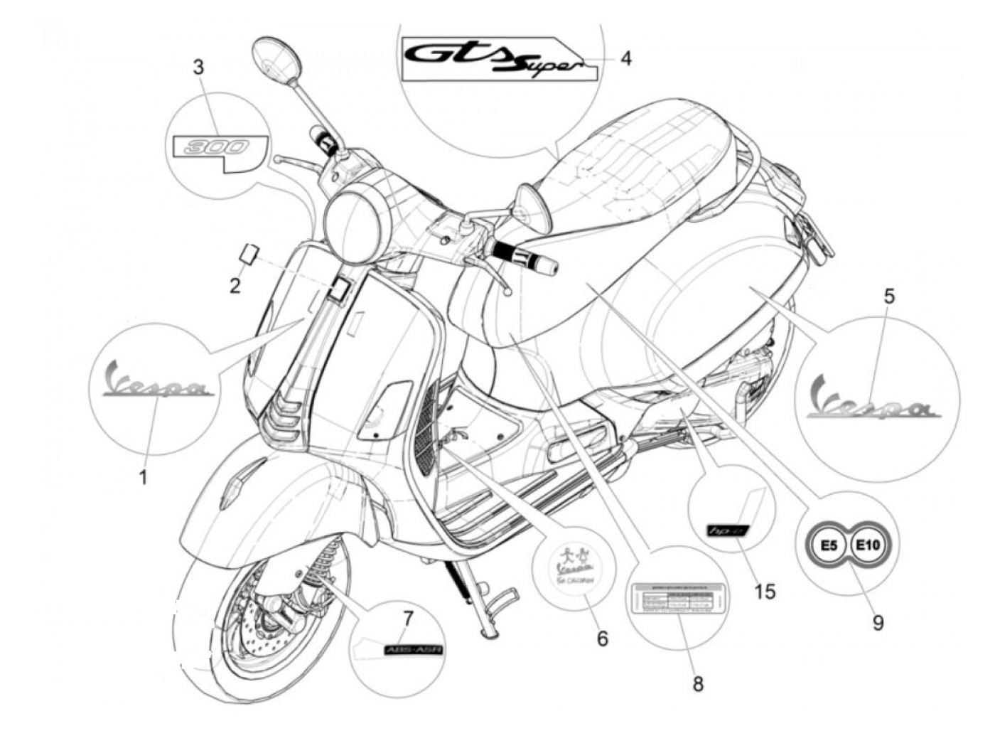 Belettering -PIAGGIO- (E5)/(E10) - Vespa GTS 125 (ZAPMA3700), Vespa GTS HPE 300 (ZAPMA3600), Vespa GTS Super 125 (ZAPMA3700), Vespa GTS Super HPE 300 (ZAPMA360, ZAPMD3100, ZAPMD3101, ZAPMD3102), Vespa Primavera 125 (ZAPMA1100, ZAPMA1101, ZAPMD1100), Vespa