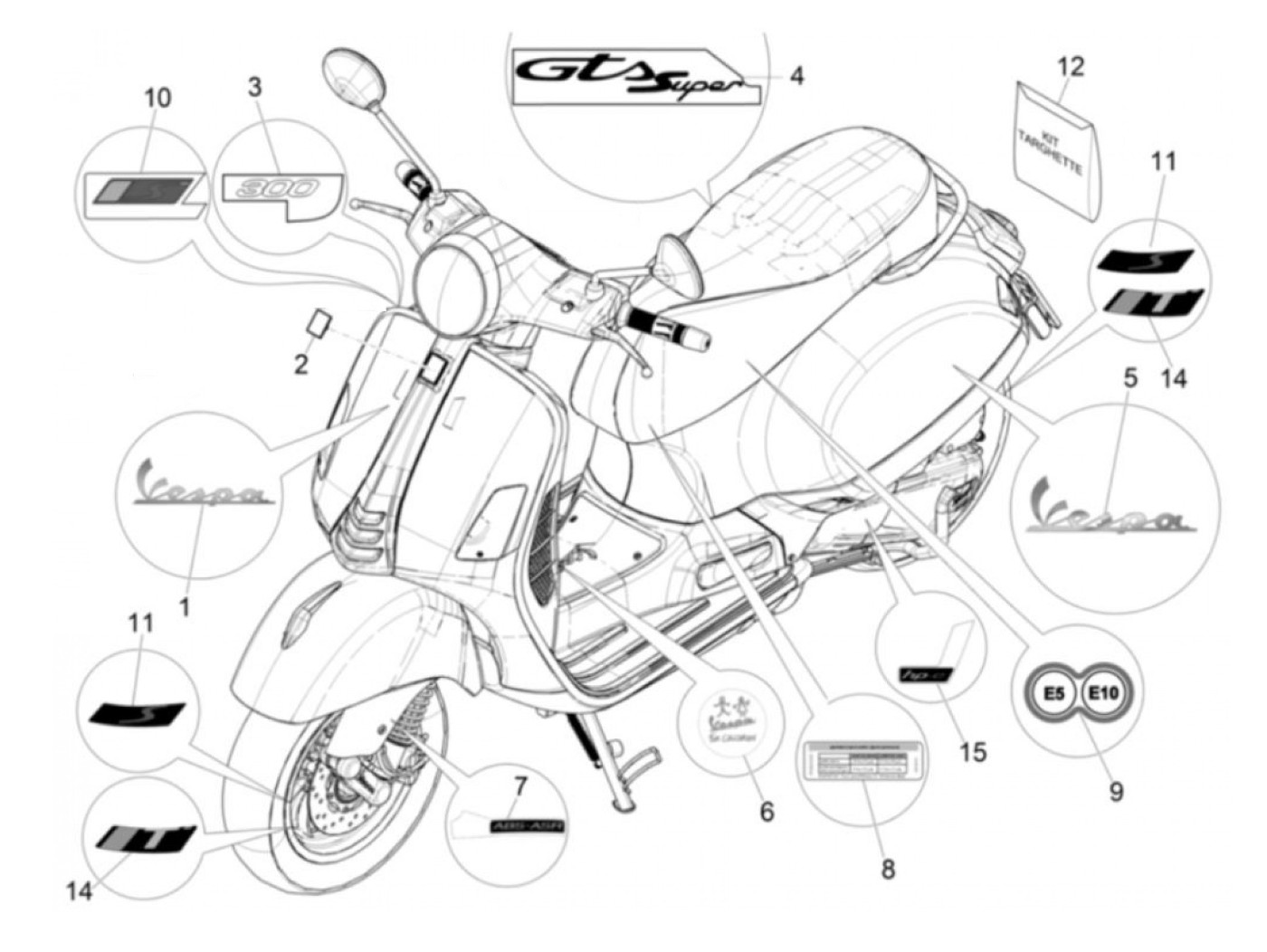 Belettering -PIAGGIO- Vespa voor kinderen - Vespa GTS 125 (ZAPMA3100, ZAPMA3200, ZAPMA3700), Vespa GTS 150 (ZAPMA3200, ZAPMA3100), Vespa GTS 250 (ZAPM45100), Vespa GTS 300 (ZAPM45200, ZAPM45202, ZAPMA3300), Vespa GTS HPE 300 (ZAPMA3600), Vespa GTS Super 1
