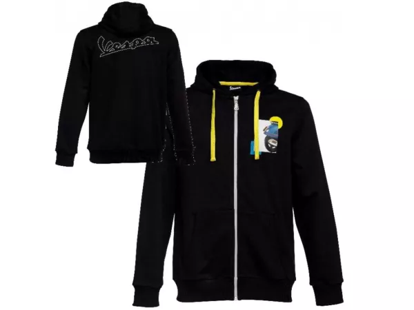 Sweaterjack van 100% katoen, geborsteld aan de binnenkant, voor alle seizoenen. Vespa patch en logo op de voor- of achterkant. Ritssluiting met reflectoren, metalen rits met "Tricolore" detail. De manchetten bij de polsen en taille zijn van elastisch materiaal. Met twee zakken aan de voorkant.