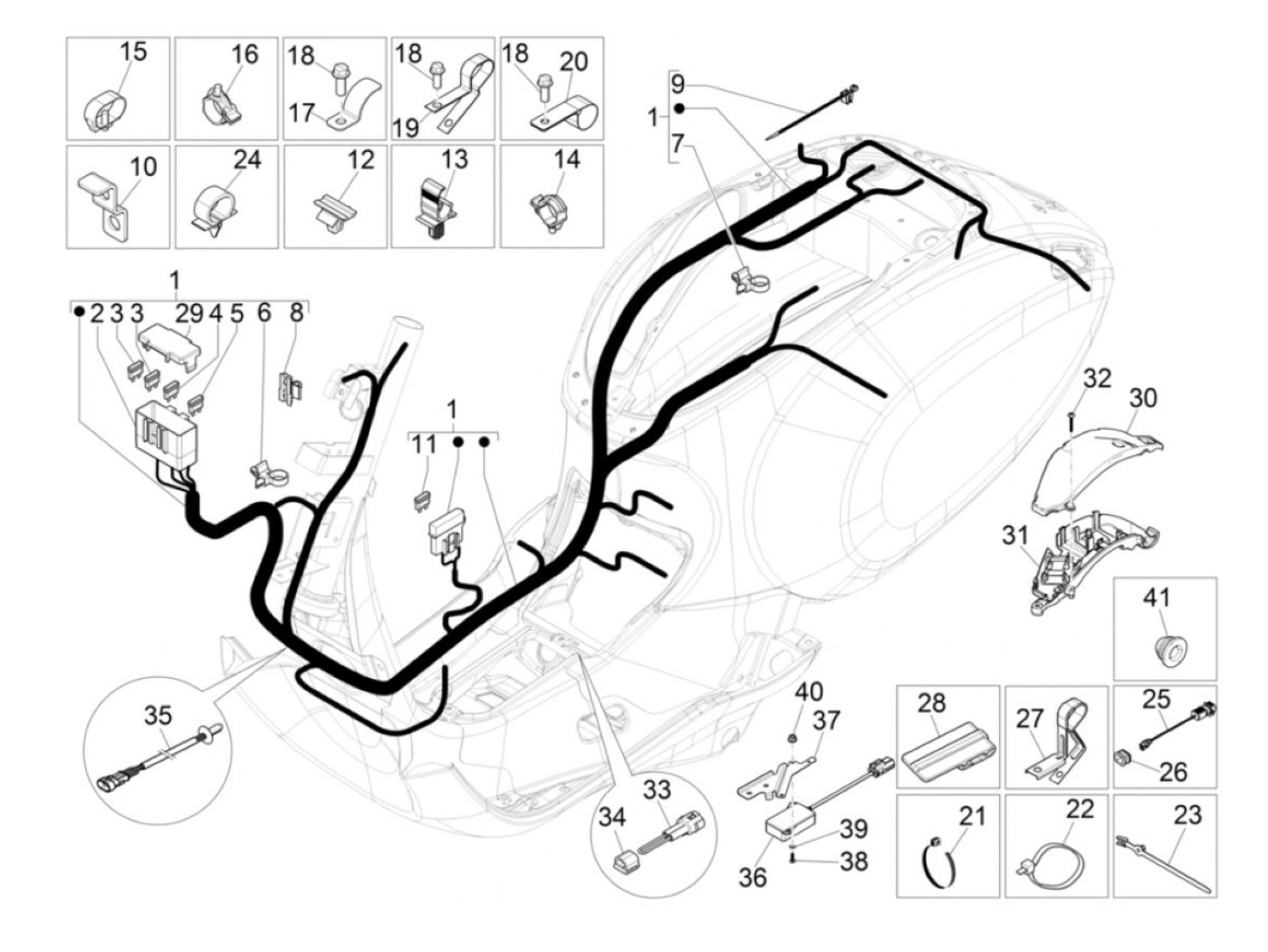 Bevestigingsklem kabelboom -PIAGGIO- Vespa Primavera 125 (ZAPM81100, ZAPM81101, ZAPMA1100, RP8M82500, RP8M82821, RP8M82100, RP8M82310, ZAPMA1101, ZAPMD1100), Vespa Primavera 150 (ZAPM81200, ZAPMA1200, ZAPM81201, ZAPMA1201, ZAPMD120), Vespa Primavera 50