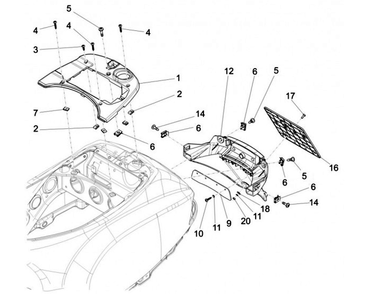 Afdekking achter helm compartiment -PIAGGIO- Vespa ET4 (ZAPM04, ZAPM19, ZAPC26), Vespa LX (ZAPC38, ZAPM44,ZAPM68), Vespa LXV (ZAPC38, ZAPM44,ZAPM68), Vespa S (ZAPC38, ZAPM44,ZAPM68)