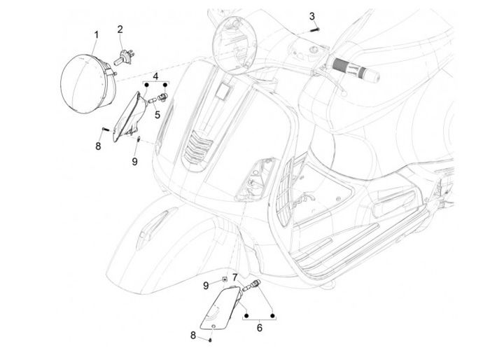 Koplamp, zonder parkeerlicht, links verkeer -PIAGGIO- Vespa GTS 150 (ZAPMA3200, ZAPMA3100), Vespa GTS 250 (ZAPM45100), Vespa GTS Super 125 (ZAPM45300, ZAPMA3100, ZAPMA3200, ZAPM45301), Vespa GTS Super 300 (ZAPM45200, ZAPM45202, ZAPMA3300)