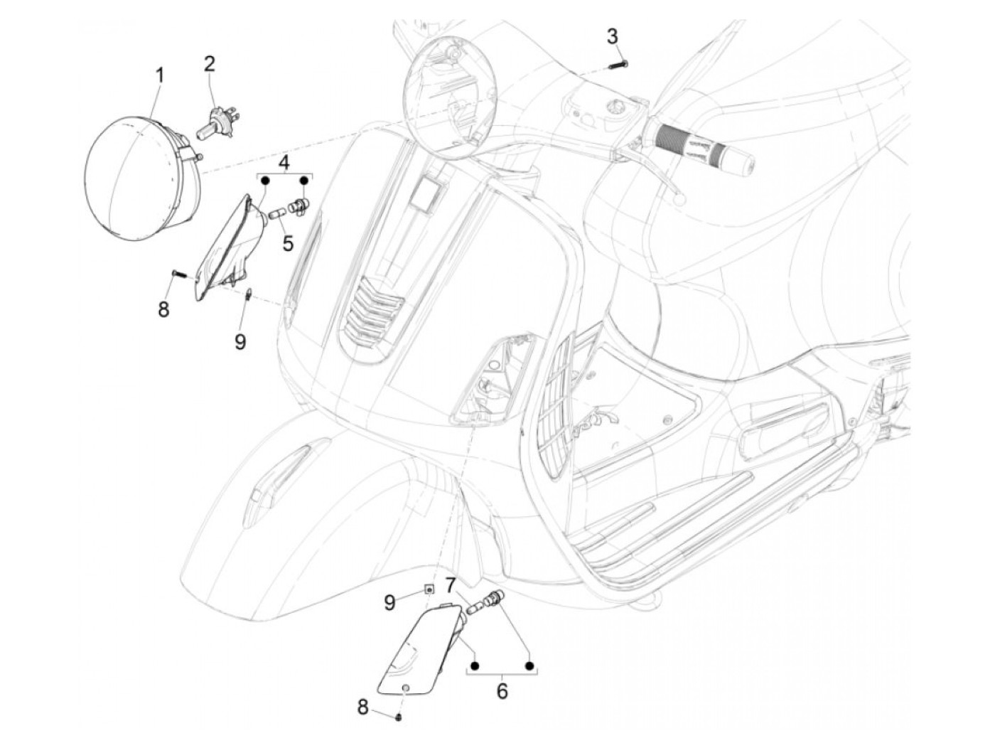 Koplamp, zonder parkeerlicht, rechtsrijdend -PIAGGIO- Vespa GTS 150 (ZAPMA3200, ZAPMA3100), Vespa GTS 250 (ZAPM45100), Vespa GTS Super 125 (ZAPM45300, ZAPMA3100, ZAPMA3200, ZAPM45301), Vespa GTS Super 300 (ZAPM45200, ZAPM45202, ZAPMA3300)