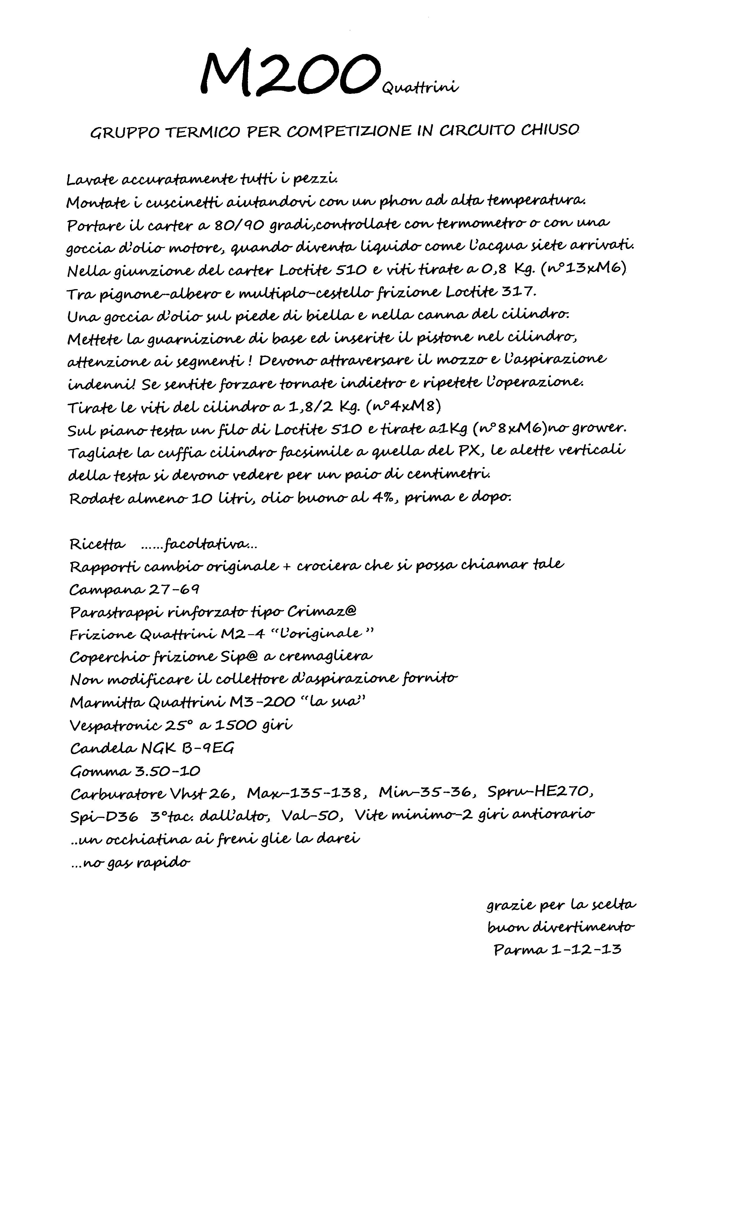 ...De basis is een volledig opnieuw ontworpen motorhuis dat is gegoten uit een hoge-sterktestaallegering. Dit biedt nu eindelijk ruimte voor een aanzienlijk bredere en daardoor uiterst stabiele krukas met maar liefst 56,5 mm slag (serie PV125 heeft 51 mm slag). In combinatie met een 116mm drijfstang vormt dit een zeer solide basis voor de krachtige 200cc cilinder van Quattrini. Deze is bewust zo ontworpen dat hij een enorme stuwkracht ontwikkelt, zelfs bij lage toerentallen, en nog steeds meer dan 30pk en 30NM uit de doos levert! Dit betekent dat de standaard versnellingsbak met brede overbrengingsverhouding zonder problemen gebruikt kan blijven worden. Koppelingsproblemen zijn uitgesloten dankzij de zeer brede en substantiële vermogensband