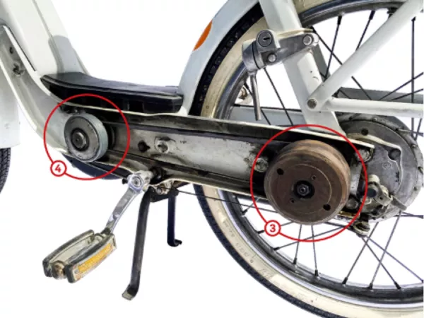 - De achterste poelie vervangen. De originele poelie van de Ciao heeft een diameter van 90 mm. Maar alleen de poelies met 70mm of 80mm zijn echt berijdbaar, want hier is het aandraaien bij het wegrijden nog acceptabel.