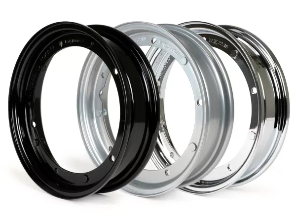 De velgen in de maat 2.10-10 kunnen worden gebruikt voor alle voertuigen met 3.00-10 en 3.50-10 banden. Kan zowel voor als achter worden gebruikt.