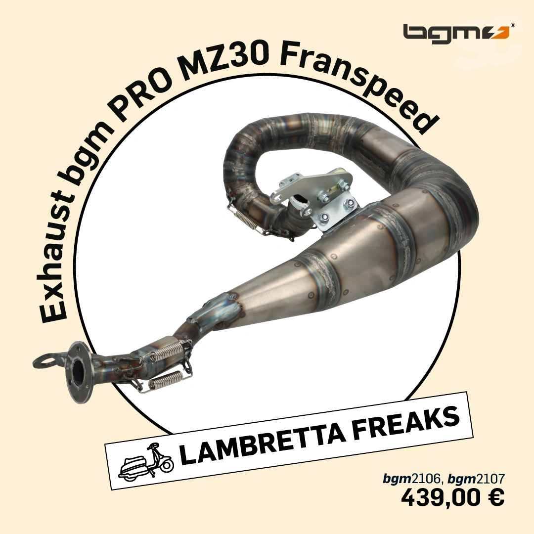 Escape Lambretta bgm PRO MZ30 Franspeed por Andy Francis Scooters. Sistema de escape de resonancia de muy alto par con todas las características de los sistemas de escape Franspeed en términos de instalación, durabilidad y durabilidad de larga distancia