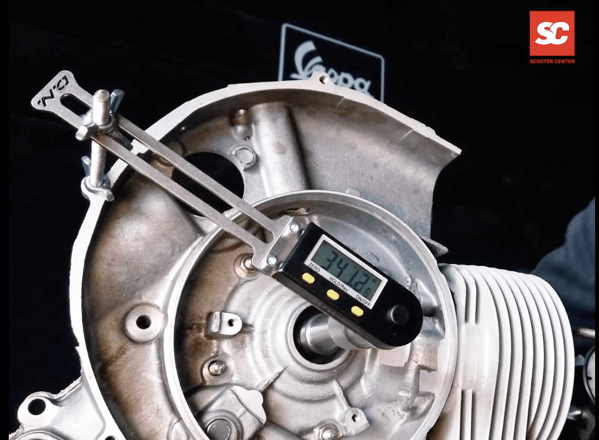 Attach a degree disc or digital protractor to the flywheel side. Many options exist, but digital tools like the Buzz Wangle are easiest since they don’t require referencing the engine case.