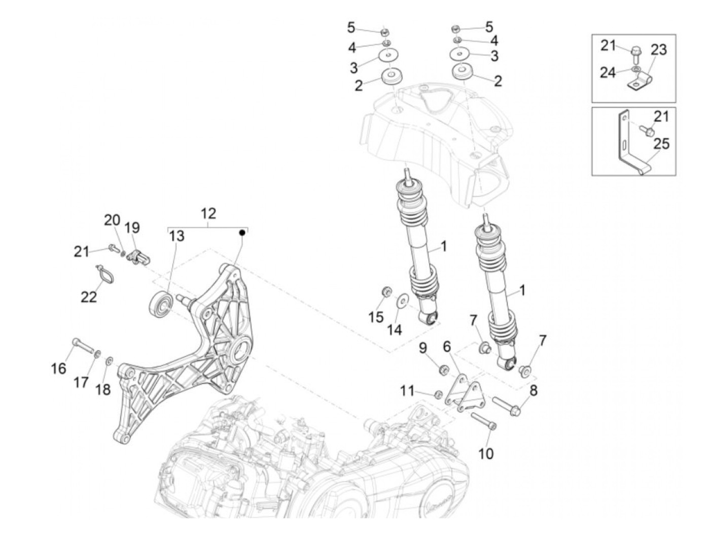 Stötdämparfäste på motor, vänster -PIAGGIO- Vespa GT 250 (ZAPM45102), Vespa GT L 125 (ZAPM31100, ZAPM31101), Vespa GT L 200 (ZAPM31200), Vespa GTS 125 (ZAPM31300), Vespa GTS 250 (ZAPM45100, ZAPM45101), Vespa GTS 300 (ZAPM45200, ZAPM45202, ZAPMA3300), Ve