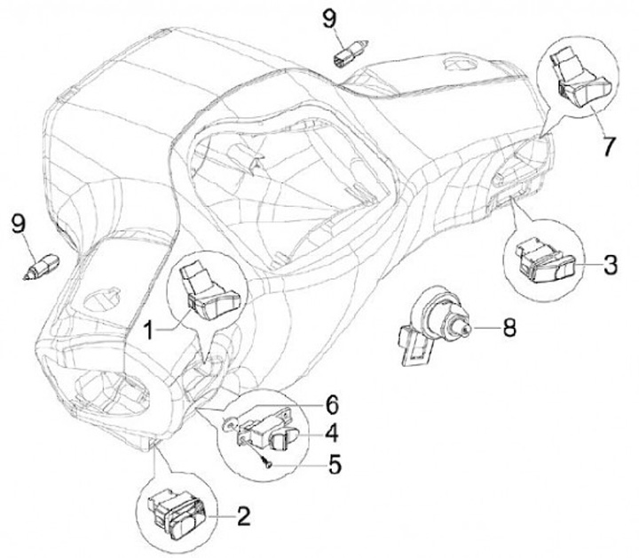 Startbrytare -PIAGGIO- Vespa GT L 125 (ZAPM31101), Vespa GTS 125 (ZAPM31300, ZAPMA3100, ZAPMA3200, ZAPMA3700, ZAPMD3200, ZAPMD3201), Vespa GTS 150 (ZAPMA3200, ZAPMA3100), Vespa GTS 250 (ZAPM45100, ZAPM45101), Vespa GTS 300 (ZAPM45200, ZAPM45202, ZAPMA3