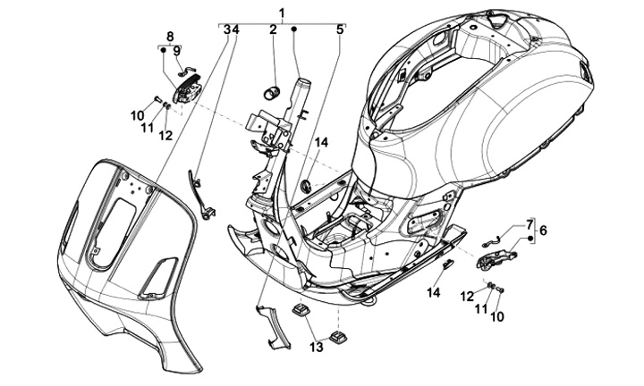 Fäste för bagageutrymme, kylare vänster -PIAGGIO- Vespa GT 250 (ZAPM45102), Vespa GTS 125 (ZAPM31300, ZAPMA3100, ZAPMA3200, ZAPMA3700), Vespa GTS 150 (ZAPMA3200, ZAPMA3100), Vespa GTS 250 (ZAPM45100, ZAPM45101), Vespa GTS 300 (ZAPM45200, ZAPM45202, ZAPMA3