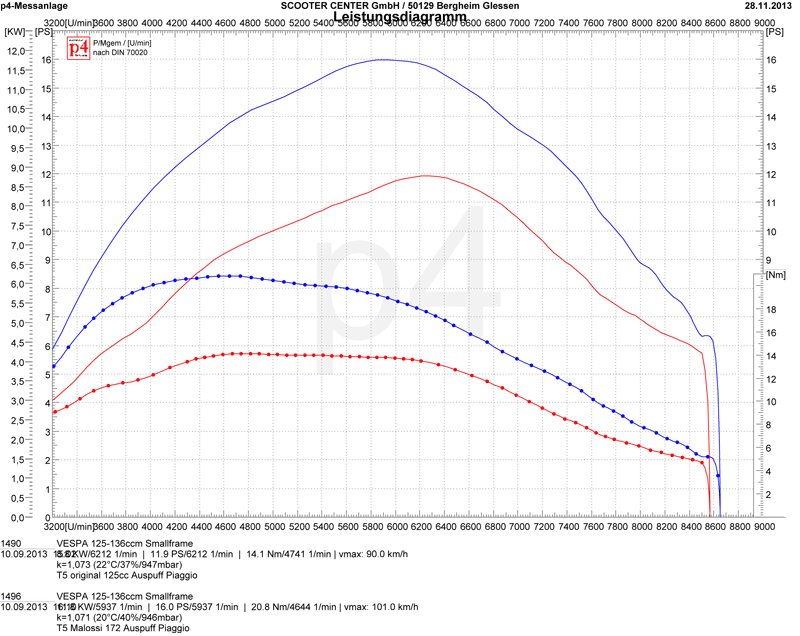 Malossi har redan en längre topplocksvinkel (ca 120°/176°) än originalcylindern, men i kombination med originalavgasröret förblir den en absolut vridmomentångare som levererar sitt fulla vridmoment vid drygt 4500 rpm. Redan vid 4000 rpm levererar den 8NM mer vridmoment än originalcylindern. Den förblir därför den obesegrade kungen av trafikljusen. Full effekt finns också tillgänglig under 6000 rpm, men cylindern kan varvas ut mycket längre. Först vid 7500 rpm sjunker Malossi under 12 hk, den maximala effekt som originalcylindern kan leverera. Malossi uppger att 172:an kan köras med originalcylinderhuvudet. Ett anpassat originalhuvud är dock mer rekommenderat, även om det inte längre tillverkas.