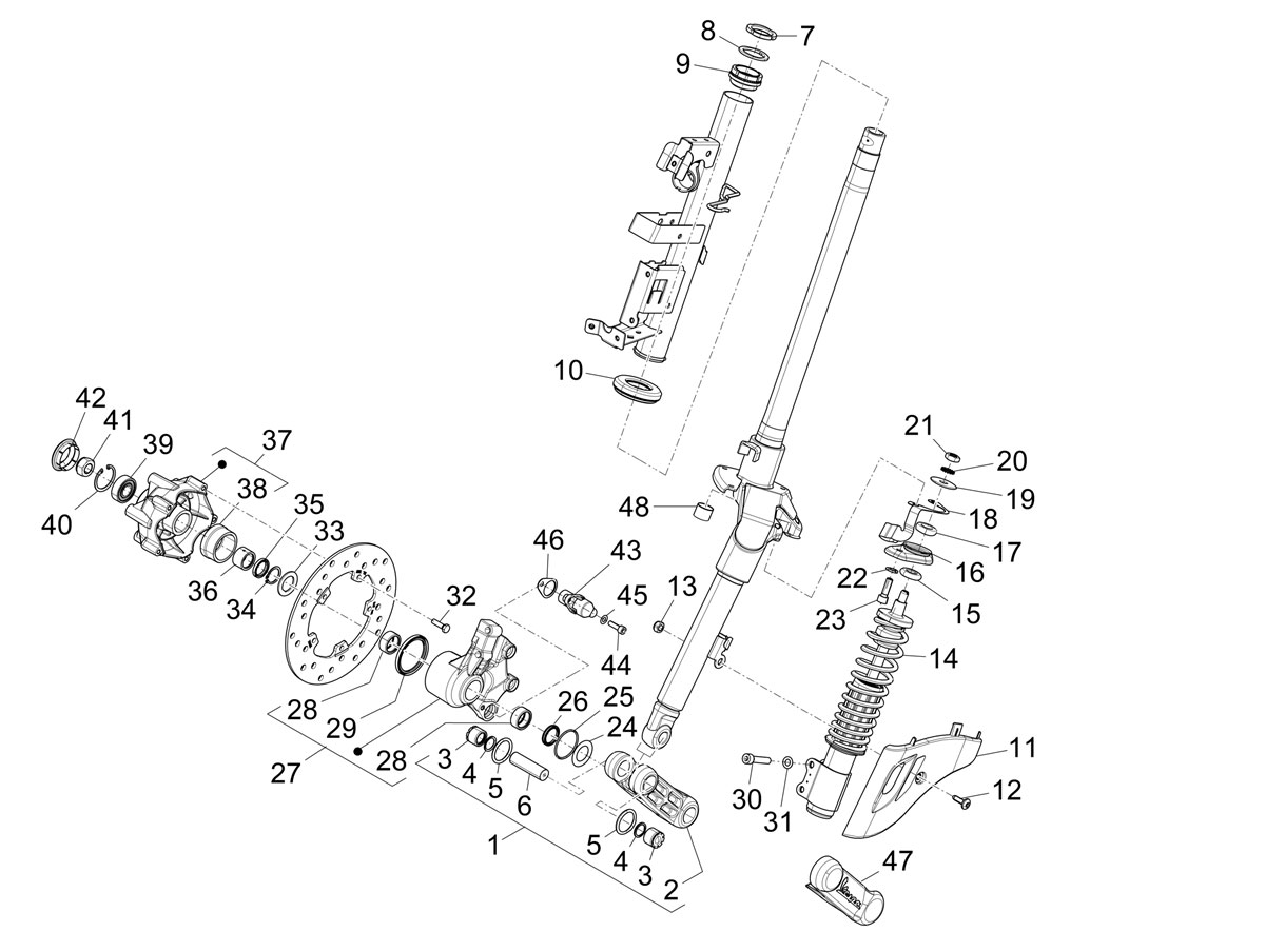 Stötdämpare fram -PIAGGIO- Vespa Primavera 150 (ZAPMD120), Vespa Primavera 50 (ZAPC53200, ZAPCD010), Vespa Sprint 125 (ZAPMA1300, ZAPMA1301, ZAPMD1101), Vespa Sprint 150 (ZAPMA1400, ZAPMA1401, ZAPMD1201), Vespa Sprint 50 (ZAPC53101, ZAPC53201, ZAPC536B,