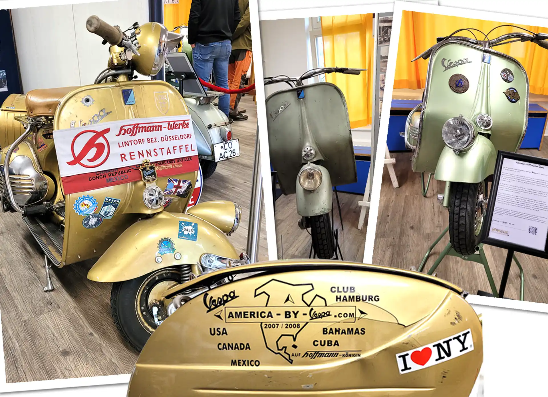 Vi tog oss tid för att besöka utställningen av Vespa Club Hamburg och Hoffmann-Vespa Hamburg. I en liten men imponerande samling kunde man bland annat se Tysklands äldsta Hoffmann-Vespa. Särskilt spännande var historien om Hendrik “Moinsen” och Christian Z., som 2007 med två otrimmade Hoffmann-Vespor körde runt Amerika. Ett äventyr inte präglat av hastighet, men av hundratals unika historier och möten. Fler detaljer finns på deras