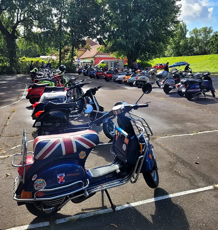 Vespor puttrade (eller dånade) oavbrutet förbi oss mot parkeringen, en färgstark blandning av moderna automatscootrar och gamla växlingspärlor. Så småningom smög sig – ursäkta, dånade sig – även några fina (och högljudda) Lambrettor in bland deltagarna. Scooterentusiaster från Tyskland, Italien, Schweiz och Österrike samlades i Moorwerder för att fira klubbens 75-årsdag i Hamburg på bästa sätt.