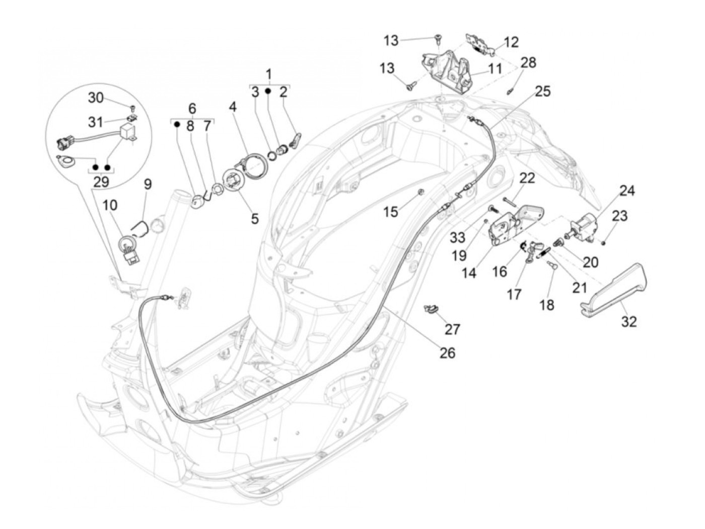 On-Off-Lock-uttag -PIAGGIO- Vespa GTS 125 (ZAPMA3100, ZAPMA3200, ZAPMA3700), Vespa GTS 150 (ZAPMA3200, ZAPMA3100), Vespa GTS 300 (ZAPMA3300), Vespa GTS HPE 300 (ZAPMA3600, ZAPMD310), Vespa GTS Super 125 (ZAPMA3100, ZAPMA3200, ZAPMA3700), Vespa GTS Super