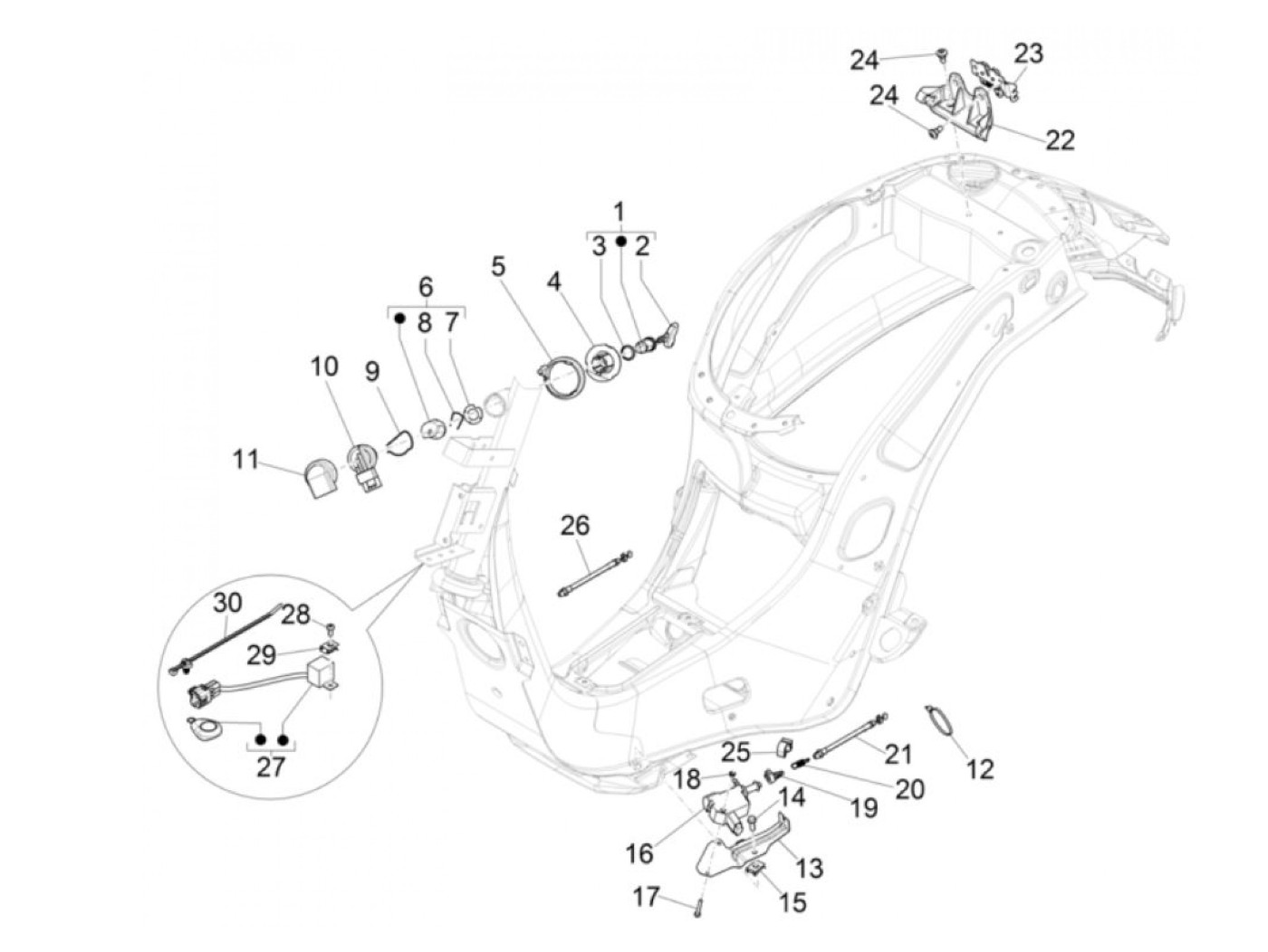 On-Off-Lock-uttag -PIAGGIO- Vespa GTS 125 (ZAPMA3100, ZAPMA3200, ZAPMA3700), Vespa GTS 150 (ZAPMA3200, ZAPMA3100), Vespa GTS 300 (ZAPMA3300), Vespa GTS HPE 300 (ZAPMA3600, ZAPMD310), Vespa GTS Super 125 (ZAPMA3100, ZAPMA3200, ZAPMA3700), Vespa GTS Super